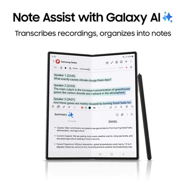 *Bild simulerad. Faktiskt UX/UI kan skilja sig. *Sammanfattningsfunktionen för Note Assist kräver nätverksanslutning och inloggning till Samsung-konto. Tjänstens tillgänglighet kan variera beroende på språk. Sammanfattningsfunktionen för Note Assist aktiveras när ett visst antal tecken uppnås och är under teckengränsen. Röstinspelningsfunktionen för Note Assist kanske inte stöds i vissa länder. Ljudfiler måste vara under 3 timmar långa för att kunna behandlas. Noggrannheten av resultaten garanteras inte. *Samsung Galaxy Z Fold6 har inget inbyggt fack för S Pen. S Pen säljs separat. Använd en S Pen som är designad för Galaxy Z Fold. S Pen Fold Edition är kompatibel med Samsung Galaxy Z Fold5 och Z Fold6. Alla andra S Pen eller styluspennor kan skada skärmen. Stöd för S Pen är begränsat till huvudskärmen.