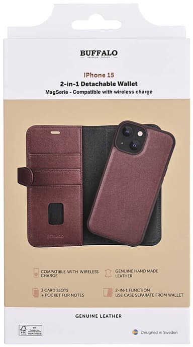Buffalo iPhone 15 2-i-1 Leather MagSeries plånboksfodral erbjuder fall- och stötskydd samtidigt som du har tre ID- och kortfack och en sedelficka för att hålla alla dina saker till hands. Fodralet har även ett löstagbart innerfodral.Läs mer om produkten