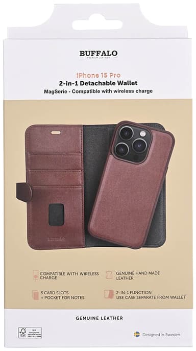 Buffalo iPhone 15 Pro 2-i-1 Leather MagSeries plånboksfodral (brunt)