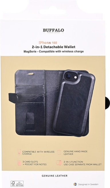 Buffalo iPhone 16E 2-i-1 plånboksfodral (svart)