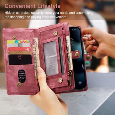 Blixtlås fack för kontanter. Tillverkad i retrostil split läder + plastmaterial, hög kvalitet och hållbar. Löstagbar 2-i-1 design, läder och inre läder belagt hård skal. Magnetlås och snäppfäste för säker förvaring av kort och kontanter. Skydda din telefon från daglig skada och bär dina tillhörigheter med stil.