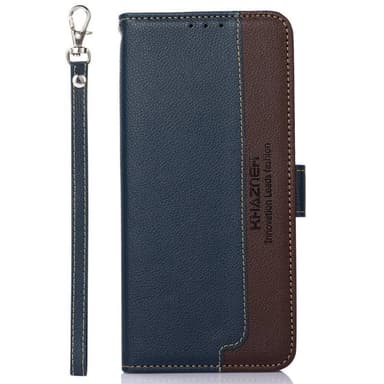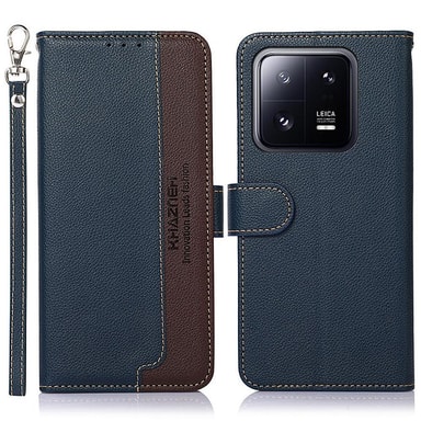 KHAZNEH RFID Blocking Litchi Texture PU-läderfodral med remstativ Plånbok Fallsäkert skal för Xiaomi 13 Pro 5G - Blå/Brun