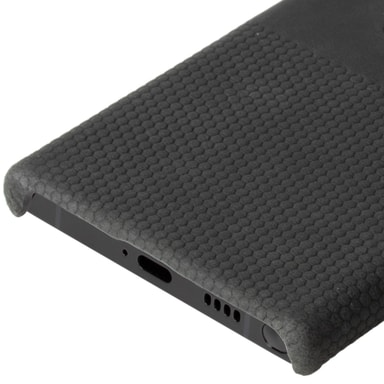 Den tunna designen ger full tillgång till skärmen och exakta utskärningar för alla knappar som ger enkel åtkomst. Höljet har en blandning av två olika texturer av äkta premiumläder. En slät lädertextur i mitten, omgiven av ett präglad hexagonalt honungskaksmönster, vilket förbättrar greppet och känslan på skalet.