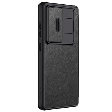 NILLKIN Qin Pro Series för Samsung Galaxy S25 Ultra är ett elegant fodral med kortplatser och en stilren design i svart konstläder. Ytan är belagd med högkvalitativt PU-läder i kombination med ett tåligt PC-bakstycke och en mjuk TPU-ram, vilket ger ett nobelt och elegant utseende samtidigt som hållbarheten säkerställs.