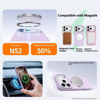 Detta tunna silikonskalet kombinerar stilren design med praktisk funktionalitet. Med inbyggda starka magneter är det helt kompatibelt med MagSafe-laddning, vilket gör trådlös laddning smidig och effektiv utan att ta bort fodralet. Det högkvalitativa, mjuka flytande silikonmaterialet ger en hudvänlig känsla och ett säkert grepp, medan det stötdämpande PC-lagret skyddar din telefon mot stötar. En mjuk fiberinredning skyddar mot repor och absorberar stötar. Fodralet är dessutom motståndskraftigt mot olja, smuts och fingeravtryck, vilket håller din telefon ren. Den stora kamerautskärningen skyddar kameran utan att störa fotografering.