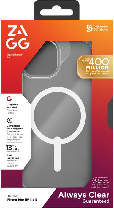 Zagg Crystal Palace Apple iPhone 16E/15/14/13 fodral erbjuder snyggt skydd med reptålig yta, 4m fallskydd och gulningsmotstånd.Läs mer om produkten