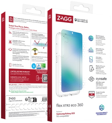 Ge din telefon ett heltäckande skydd med ett Zagg Flex XTR2 Eco 360 Samsung S23 skal- och skärmpaket. Det innehåller ett tåligt skal och skärmskydd med en antireflektionsbeläggning och ett Eyesafe-filter för blått ljus.Läs mer om produkten