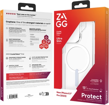 Tack vare Zagg iPhone 15 Pro Crystal Palace Snap-skal kan du hålla ditt skydd mot fall och stötar upp till 4 meter. Med en reptålig yta, rundade kanter och MagSafe-kompatibilitet.Läs mer om produkten