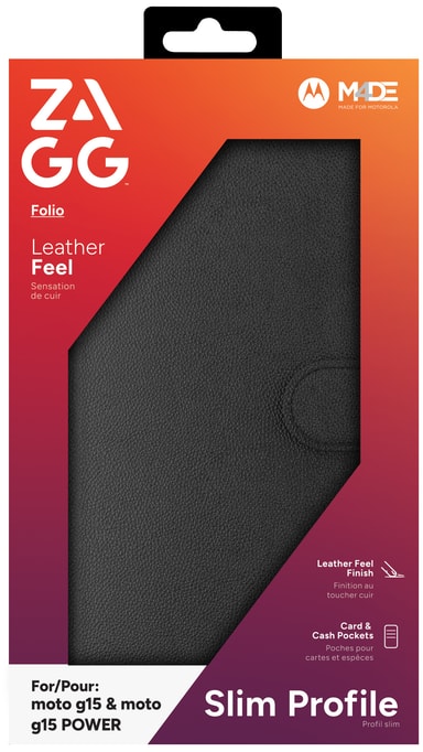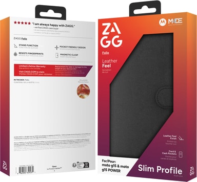 Zagg Motorola G15/G15 Power plånboksfodral är ett pålitligt fodral som håller din telefon skyddad i alla vardagssituationer. Detta slimmade, eleganta plånboksfodral är tillverkat av PU-läder och inkluderar kortplatser och ett praktiskt inbyggt ställ.Läs mer om produkten