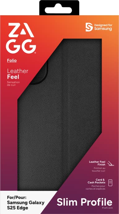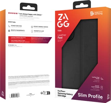 Zagg Samsung Galaxy S25 Edge plånboksfodral är ett pålitligt skydd som håller din telefon säker i alla vardagliga situationer. Detta smala, eleganta plånboksfodral är tillverkat av PU-läder och har kortplatser samt ett praktiskt inbyggt stöd.Läs mer om produkten
