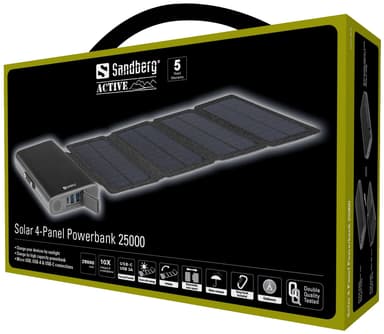 Sandberg Solar 4-Panel Powerbank 25000 ger dig massor av ström till dina enheter, ända upp till tio laddningar av en typisk smartphone. Och om du befinner dig långt borta från ett vägguttag, kan du ladda powerbanken snabbt med hjälp av den stora v...Läs mer om produkten
