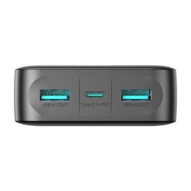 Powerbanken är utrustad med portar som gör att du kan ladda upp till tre enheter samtidigt. Två USB-A-portar (12W vardera) och en Type-C-port (12W) gör att du kan ladda telefoner, surfplattor, hörlurar och andra enheter samtidigt, utan att behöva sluta ladda en för att koppla in en annan.