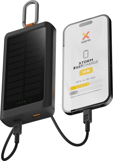 Xtorm 15W Go2 10.000mAh Soldriven powerbank erbjuder snabbladdning med 15W FastCharge, 10 000 mAh kapacitet för två fulla mobilladdningar, en solpanel, inbyggd lampa och karbinhake, perfekt för utomhusäventyr och resor.Läs mer om produkten