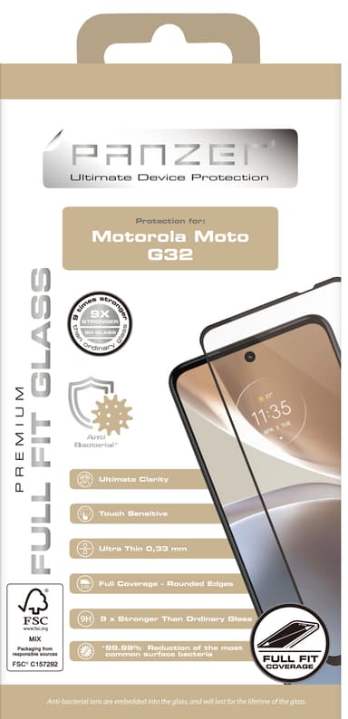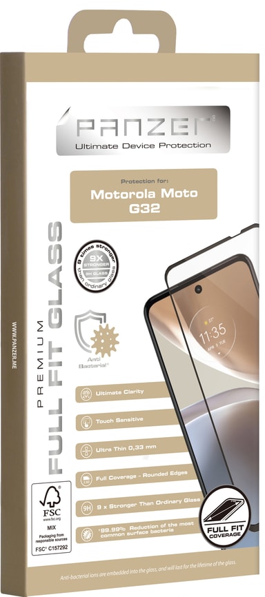Panzer Full-Fit skärmskydd för Motorola G32 som är gjort av 0.33 mm tunn silikatglas med böjda kanter och splittersäker film säkerställer ett utmärkt skärmskydd i alla situationer.Läs mer om produkten