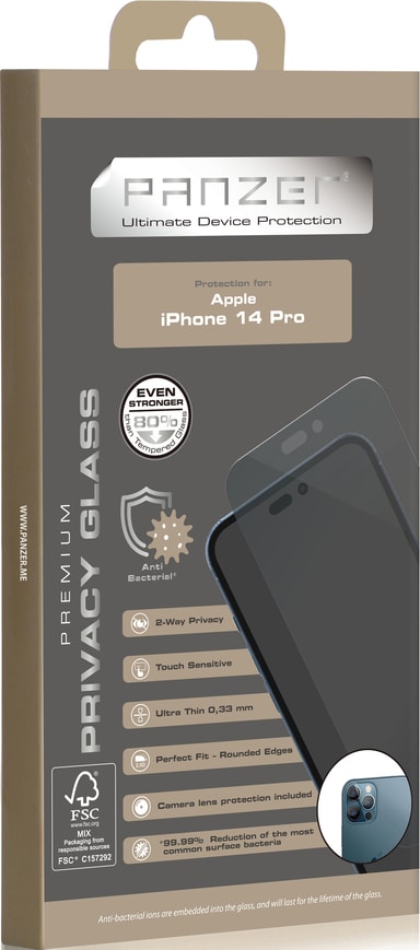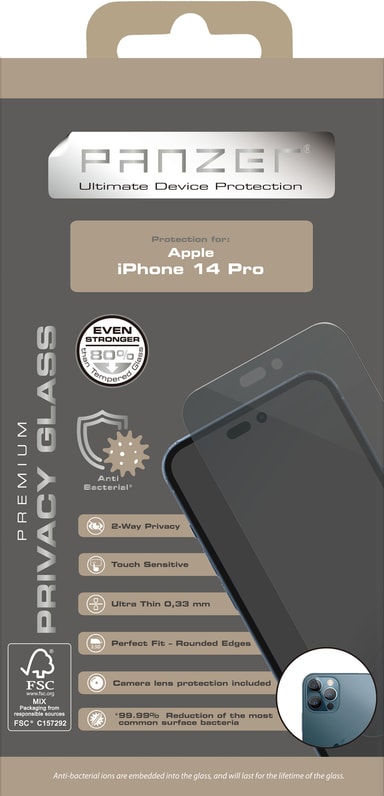 Panzer Privacy skärmskydd för iPhone 14 Pro är tillverkat av silikatglas som täcker hela skärmen och har rundade kanter för bekväm användning. Antisplitterfilmen säkerställer att glasskärvorna inte spricker om skyddet går sönder.Läs mer om produkten