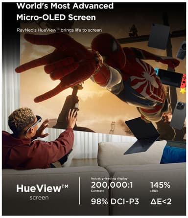 TCL RayNeo Air 3s VR-glasögon erbjuder en 201" HueView™ megaskärm med 98% DCI-P3 färgåtergivning, dubbla ljudkammare, OptiCare™ ögonanpassning och 9-punkts individuell passform för uppslukande, privat underhållning var som helst.Läs mer om produkten