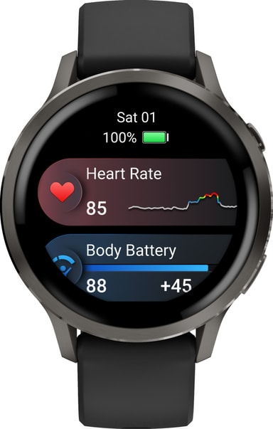 Garmin Venu 4 smartklocka erbjuder hälsoövervakning dygnet runt, avancerad sömnregistrering, EKG-mätning och HRV-status, med en AMOLED-skärm och upp till 10 dagars batteritid.Läs mer om produkten