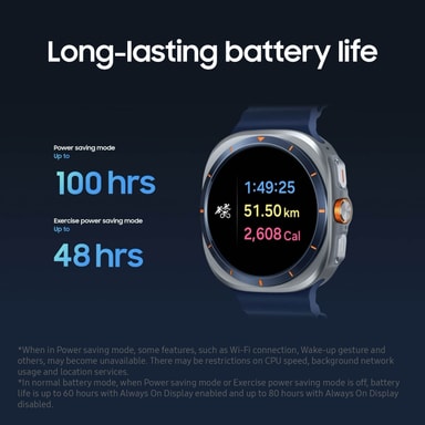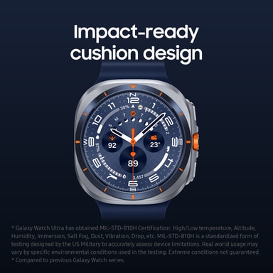 Samsung Galaxy Watch Ultra är byggd för extrema situationer – med ett titanhölje, safirglas och vattentålighet. TRegistrera sömn, träning och näring via Galaxy AI på en skarp 1,5-tums Super AMOLED-skärm, allt drivet av ett lång varande batteri.Läs mer om produkten