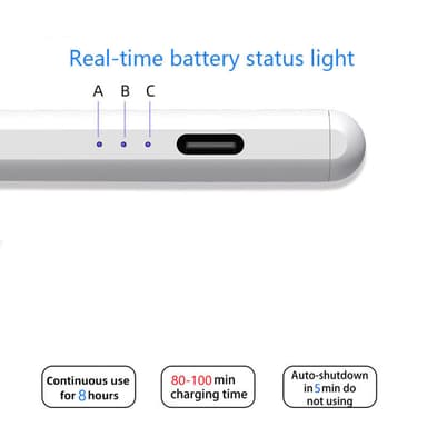 Spetsen är utbytbar och pennan stängs automatiskt av efter 5 min i standby för att spara batteri. Laddas med medföljande USB-C-kabel. Batteristatus visas med indikatorljus på pennan.