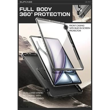 Supcase Unicorn Beetle Pro surfplatteskal är konstruerad för att möta de högsta standarderna och ger din surfplatta det bästa skyddet. Med en stötabsorberande baksida av polykarbonat och med kanter av TPU och en framsida av polykarbonat så erbjuder detta surfplatteskal ett skydd av militärklass mot repor, stötar och fall. Supcase har vunnit CNET:s första pris genom olika tester med att släppa skalet från olika höjder utan att gå sönder. Supcase har även erhållit det amerikanska militärcertifikatet MIL-STD 810G-516.6. Surfplatteskalet har ett integrerat ställ som kan fällas ut vid behov. Integrerat skärmskydd håller surfplattans skärm skyddad från smuts och repor.