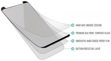 Fyra lager av noga utvalda och genomtänkta material ger ett skärmskydd som motstår sprickor och repor bättre än andra skärmskydd. Skyddande bottenlager- stötsäker skyddsfilm- härdat glas och sist men inte minst ett ytskikt av nanobeläggning som är smuts- och vattenavvisande – detta är vinnarreceptet för att skydda din skärm. Mot allt.
