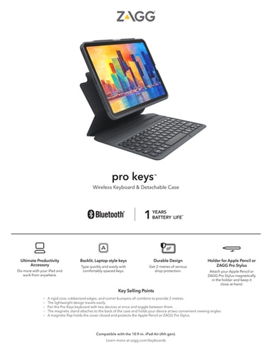 Zagg Pro Keys tangentbordsfodral ger dig ett bra skydd och låter dig öka din produktivitet. Detta tangentbordsfodral kommer med bakbelyst tangentbord och samma känsla som en bärbar dator samt fallskydd upp till 2 meter.Läs mer om produkten