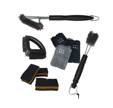 Skaffa FCC BBQ rengöringskit 10063 för bättre grillunderhåll. Kitet innehåller trippelhuvudborste, 3-i-1-borste, liten borste, 3 rengöringssvampar, 2 kraftiga rengöringsdukar och en putsduk.Läs mer om produkten