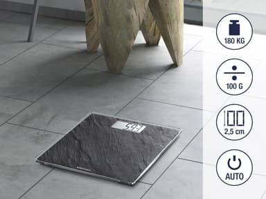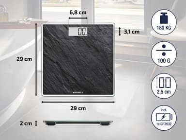 Automatisk on/off funktion. Lättläst LCD-skärm med 2,5 cm höga siffror. Tillverkad av extra starkt säkerhetsglas - 8 mm. Max vikt 180 kg / 100 g intervall. 29 x 29 x 2cm Inkl CR2032 batteri - håller minst 2 år vid 2 gångers daglig användningLäs mer om produkten