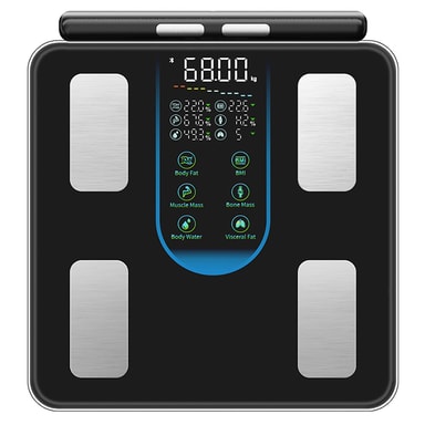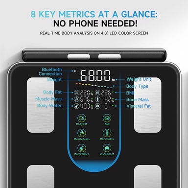 Användarvänlig Appintegration: Anslut enkelt vågen till din smartphone via Bluetooth och synkronisera din data till den användarvänliga appen. Appen ger tydliga och lättförståeliga visualiseringar av dina framsteg över tid. Spåra dina viktminsknings- eller muskelökningsmål, ställ in påminnelser och dela dina prestationer med vänner och familj. Appen lagrar din historiska data, vilket gör att du kan identifiera trender och mönster i din kroppssammansättning. LED-färgskärmen på själva vågen visar också viktiga mätvärden för snabba och bekväma avläsningar.