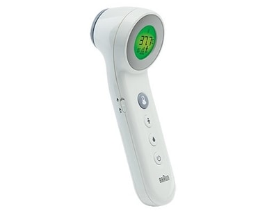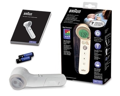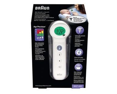 Braun 3-i-1 No Touch-termometer ger kliniskt korrekta avläsningar utan att väcka ditt barn, och kan användas på hela familjen. Positioneringssystemet på skärmen bekräftar rätt avstånd, och vägledningsljuset riktar för exakt siktning. Den färgkodade displayen lyser grönt, gult eller rött för att visa temperaturavläsningen. Klinisk forskning visar definitionen av feber förändras när nyfödda växer till barn och barn växer till vuxna. Använd åldersprecisionsfunktionen för att välja lämplig åldersinställning och få justerbar febervägledning för alla åldrar. Temperaturer kan avläsas i Fahrenheit och Celsius och det mäter även mat- och badtemperatur.