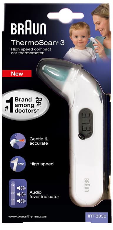Braun IRT3030WE är en digital örontermometer som kan användas av hela familjen. Den mäter av temperaturen blixtsnabbt och är utrustad med en ljudsignal som indikerar feber.Läs mer om produkten