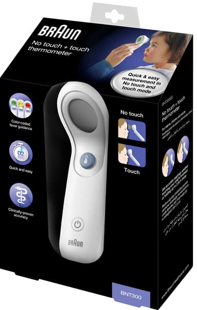 Braun termometer BNT300EE, med beröringsfritt läge och kontaktläge, positionseringsguidning, tyst läge och färgkodad skärm, kommer hjälpa dig att snabbt mäta ditt barns eller andra familjemedlemmars temperatur.Läs mer om produkten