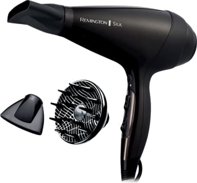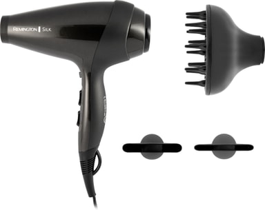 The 2400W Remington Silk hårfön AC9095 har 3 temperaturinställningar, 3 hastighetsnivåer och ett kraftfullt luftflöde på 140 km/h för snabb torkning. Jonkonditioneringen minskar friss för salongsliknande resultat för alla hårtyper.Läs mer om produkten