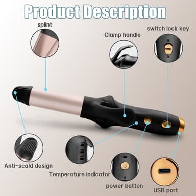 Säker och enkel att använda: Locktången erbjuder en säker användning tack vare sin inbyggda säkerhetslåsfunktion som förhindrar oavsiktlig aktivering. LED-displayen visar tydligt temperaturen, vilket möjliggör exakt värmekontroll. Dess ergonomiska design och sladdlösa funktionalitet gör den enkel och bekväm att använda.