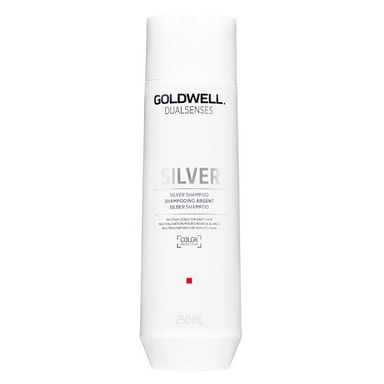 goldwell dualsenses silver shampoo neutraliserar oönskade gula skiftningar och ger en omedelbar kall effekt i blont eller grått hår. Den unika fadestopformulan är skonsam som vatten och minimerar att färgen tvättas ur.
