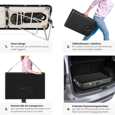 Med en praktisk hopfällbar design kan denna massagebänk enkelt packas ihop och förvaras, vilket gör den idealisk för ditt hemma-spa. Den inkluderade transportväskan gör det enkelt att ta med sig bänken vart du än önskar. Tack vare dess smidighet och bekvämlighet är vår portabla massagebänk en favorit bland användare som vill ha en lättillgänglig och portabel lösning.