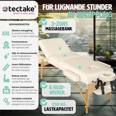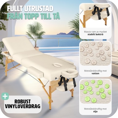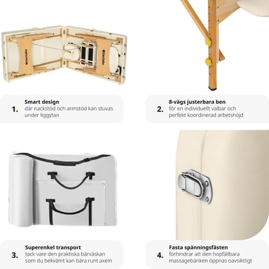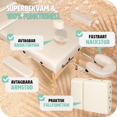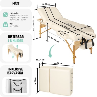 Denna lyxiga och stabila massagebänk är perfekt för långvarig användning. Massagebänken är utrustad med ett praktiskt fällsystem och kan sättas upp på några få sekunder! Denna genomtänkta behandlingsbänk ger en kombination av hög stabilitet, säkerhet och liggkomfort (underlagshöjd 10,5 cm, 7,5 cm ren stoppning) och är dessutom portabel med hjälp av den praktiska medföljande bärväskan. Den bekväma stoppningen i fincellig skumplast (Oxford 600D very strong) anpassar sig perfekt till kroppsformen och fördelar vikten jämnt och tryckpunkter undviks. Massagebänkens sköna vinylöverdrag är resistent mot repor samt vatten- och oljeresistent.