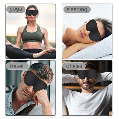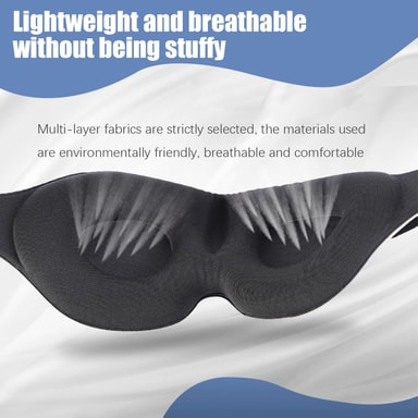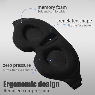 Sovmasken är tillverkad av ultramjukt material och mycket bekväm att bära. Ögonmasken blockerar effektivt ljuset och är utformad så att den inte trycker mot ögonen. Du kan fortsatt blinka som vanligt. En sovmask underlättar att koppla av och att somna även i en omgivning med störande ljus eller ljud. Inklusive öronproppar och förvaringsväska.