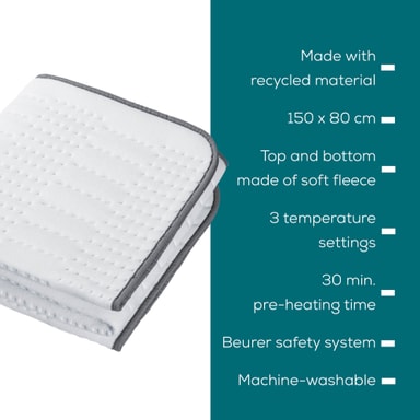 Somna bekvämt med värmen från Beurer TS 24 Green Planet värmemadrass 30090 med 3 temperaturinställningar, 30 min uppvärmningstid och automatisk avstängning. Fleecematerialet är skonsamt mot din hud och filten kan tvättas i tvättmaskin.Läs mer om produkten