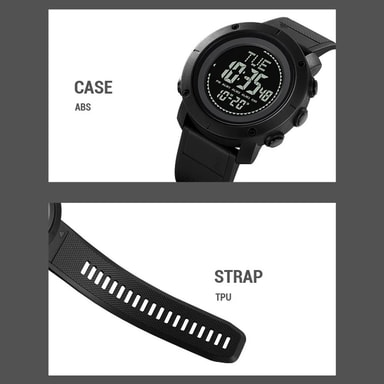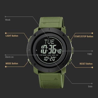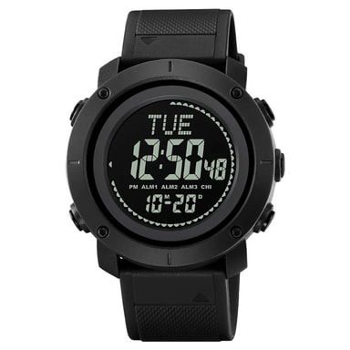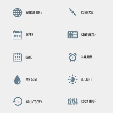 Multifunktionell elektronisk klocka inklusive världstid, kompass, stoppur, datum, 3 grupper av larm, veckodag, nedräkning, EL-ljus, timtid, 12/24-timmarsformat