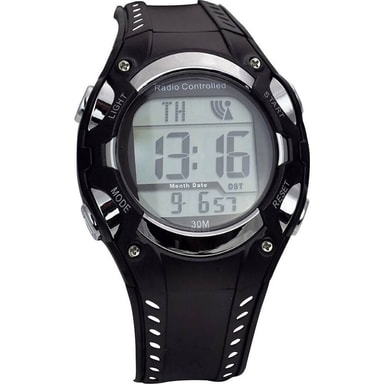 EUROTIME DCF Armbandsur 1681987 (Ø x H) 40 mm x 16 mm Svart/Silver Kapslingsmaterial=Plast Material (Armband)=PlastVisning klockslag 12/24 timmars format, veckodag, datum, månad Veckodagsvisning på engelska Larmfunktion med 1 väckningstid ochLäs mer om produkten
