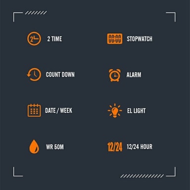 Funktioner: 2 tider, stoppur, datum, timerlarm, veckovisare, EL-lysande, timvisare, 12/24 timmar, nedräkning