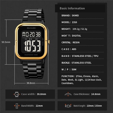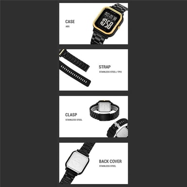 SKMEI 2316 50m Vattentät Digitalklocka Fyrkantig Elektronisk Armbandsur med EL-bakgrundsbelysning och Stoppur - Guld+Svart / Stålarmband