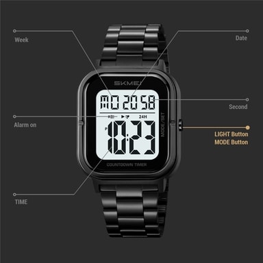 【Multifunktionell klocka】Utrustad med stoppur, datum, alarm, dagsvisning, timsignal, 12/24-timmarsformat och nedräkningstimer.