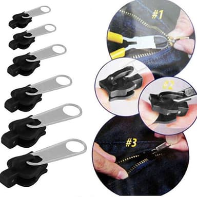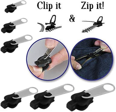 Tre olika storlekar: 6-pack med lättbytta blixtlåslöpare i 3 olika storlekar. Fungerar på de vanligaste missöden med blixtlås, som delade dragkedjor, trasiga reglage och saknade ""tänder"". Kan startas i mitten av en dragkedja och den kan dras fram och bak.
