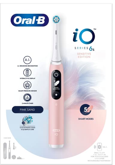 Oral-B iO 6s Sensitive-edition eltandborste 427384 ger dina tänder den professionella tandvården som de förtjänar. Utrustad med innovativ iO-teknologi, intuitiv skärm, 5 borstlägen och mer är denna tandborste den perfekta tandvårdshjälpredan för dig.Läs mer om produkten