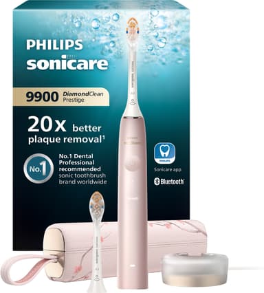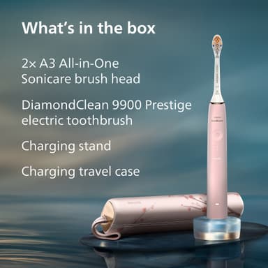 Philips Sonicare DiamondClean Prestige 9900 HX9992/31 eltandborste tar bort 20x mer plack, har över 2 veckors batteritid, ansluter till Sonicare-appen och inkluderar 2 A3 Premium All-in-One-borsthuvuden för bästa munvård.Läs mer om produkten