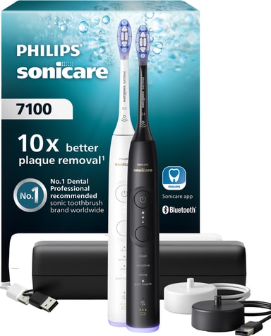 Philips Sonicare Series 7100 eltandborste HX7429/02 tar bort 10 gånger mer plack för en överlägsen rengöring. Med en batteritid på 21 dagar kan du njuta av långvarig prestanda. Den levereras med två borsthuvuden.Läs mer om produkten