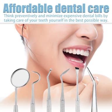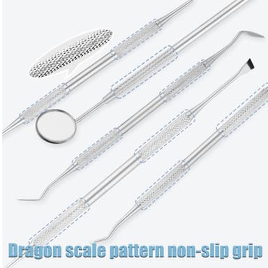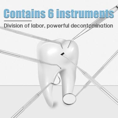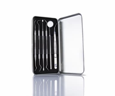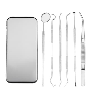 Innehåller 6 instrument: Detta set innehåller samma typ av instrument som tandläkaren använder. Det är tillverkat i kirurgiskt rostfritt stål och består av skrapor med två ändar, tång och spegel. Få bättre inblick i munnen med spegeln så du enkelt kan se tandsten som sitter på tändernas baksida eller framsida.