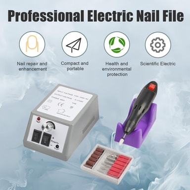 Professionell elektrisk nagelfil: Ett manikyrset med olika tillbehör för slipning och polering av naglar.